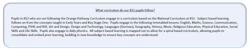 We offer our pupils a broad and balanced curriculum for all pupils. Our pupils work a key stage below their age equivalent mainstream peers due to their cognitive needs and abilities.